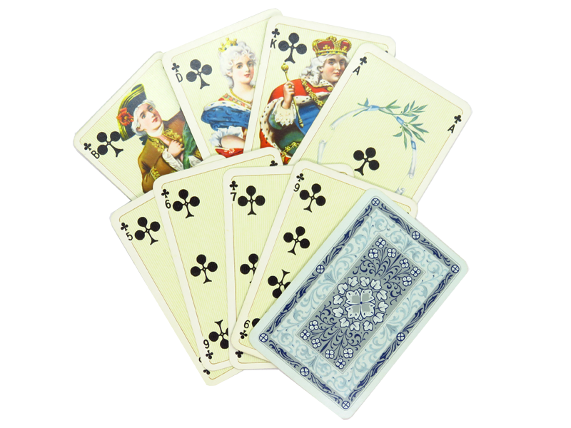 Ein besonders hübsches altes Rommé-Deck mit einer langen Geschichte. Das Deck erschien zuerst irgendwann in den frühen 1900er Jahren. Nach dem Zweiten Weltkrieg wurde das Deck sowohl von der VEB Altenburger Spielkartenfabrik als „Rokoko“ als auch von der ASS-Spielkartenfabrik, Leinfelden-Echterdingen als „Baronesse“ weiter produziert. Die gleichen Designs wurden in „Patience Cards for Women N 130“ von Faustino Solesio aus Genua, c. 1944/1945 verwendet.Die frühen Ausgaben sind sehr schöne Beispiele für Dondorfs wunderbare Chromolithographie.
