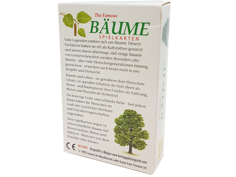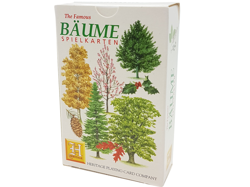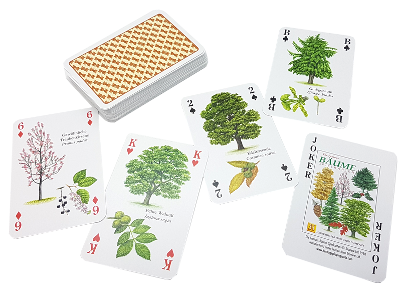 Diese Spielkarten zeigen 54 unterschiedliche Baumarten mit ihren Früchten, Blüten und Blättern.