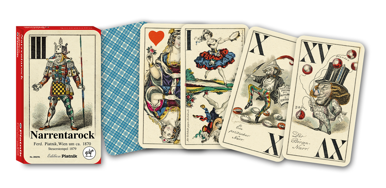 Lustiges Narren-Tarock: Die zwischen 1860 und 1865 vor „I.F.“ (Signatur auf Tarock V) gestochenen Originale stehen ganz unter dem Einfluss der satirischen Wochenzeitung „Kikeriki“ (siehe Tarock XV), die 1861 von Ottokar Franz Ebersberg gegründet wurde. Die Zeitschrift wandte sich in bissiger und manchmal derber Art gegen Bürokratie, Kirche Militär, Heuchelei und Duckmäuserei.